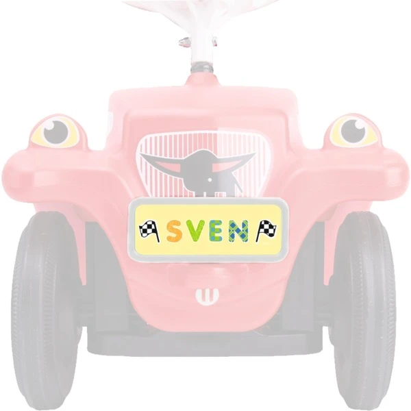 Was bei den großen Automobilen Pflicht ist, darf natürlich auch bei den kleinen Lieblingsfahrzeugen nicht fehlen: mit dem BIG-Bobby-Car Mein Nummernschild können stolze Besitzer ab 12 Monaten gemeinsam mit ihren Eltern ihr ganz individuelles Nummernschild entwerfen. Im Set ist ein Kunststoffschild mit transparentem Schutzcover enthalten, das sich leicht an der vorderen oder hinteren Anhängerkupplung aller BIG-Bobby-Car Modelle aus der New- und Classic-Reihe befestigen lässt. Es kann von oben oder unten eingesteckt werden. Zudem liegen drei Aufkleberbögen mit kunterbunt gemusterten Buchstaben und Zahlen, lustigen Symbolen und unterschiedlich farbigen Hintergründen bei. So ausgestattet kann frei nach Fantasie das persönliche Kennzeichen mit eigenem Design entstehen. Als besonderes Extra enthält das Set zudem einen BIG-Bobby-Car Führerschein.Art.-Nr.: 1237100