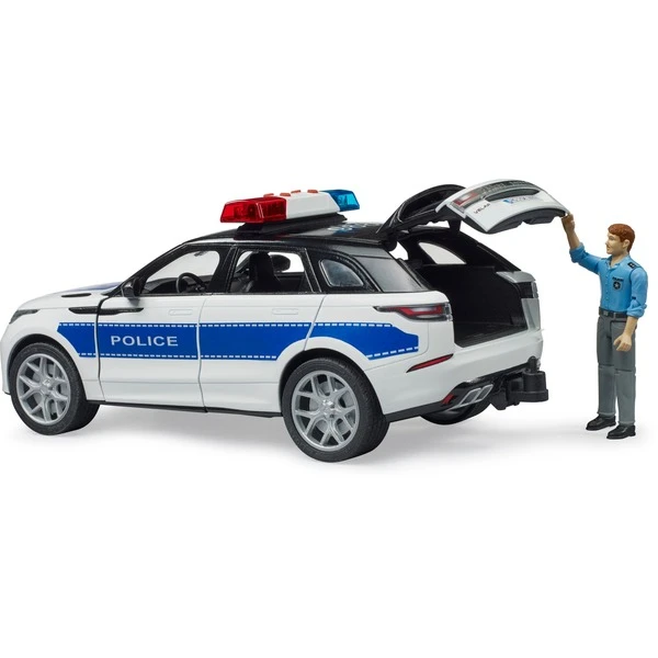 Beim Range Rover Velar treffen Eleganz und Komfort auf ein immer noch außergewöhnlich geländegängiges Fahrzeug. Mit neuen Hybrid-Antrieben, mit bis zu 400 PS und ausgereifter Allradtechnik hat dieser Geländewagen eine auffallend große Einsatz-Bandbreite. Um auch abseits der Stadt, im schwer zugänglichen Gelände aktiv sein zu können, kommt zu den bruder Einsatzkräften der Range Rover Velar in Polizeiausführung hinzu. Das Spielzeug ist, wie sein großes Vorbild, mit der 4-türigen Kabine ausgestattet. Alle Türen sind zum Öffnen und bieten Platz für bworld Figuren. Für Fahrkomfort und Geländegängigkeit ist dieses Modell im Maßstab 1:16 mit gefederten Achsen ausgestattet, wobei die Vorderachse mit der enthaltenen Lenkradverlängerung lenkbar ist. Für den Transport im Spielbetrieb kann die Heckklappe geöffnet werden, außerdem ist ein Light + Sound Modul mit 4 verschiedenen Funktionen (Motorengeräusch, Yelp-Signal, Polizei-Sirene und Feuerwehr-Sirene) installiert. Der enthaltene Polizist ist voll beweglich. Art.-Nr.: 1912163