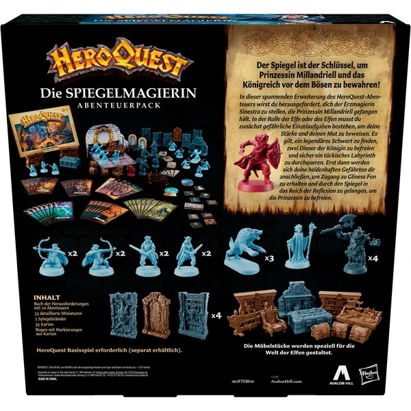Das Abenteuer rund um HeroQuest geht weiter und lässt die Spieler noch tiefer in die Welt des beeindruckenden Fantasy-Spiels eintauchen. Bei der Erweiterung „Die Spiegelmagierin Abenteuerpack“ müssen die Spieler sich der Erzmagierin Sinestra stellen, die Prinzessin Millandriell gefangen hält. In der Rolle der Elfe oder des Elfen muss ein Held zunächst riskante Einzelaufgaben bestehen. Es gilt dabei, ein legendäres Schwert zu finden, zwei Diener der Königin zu befreien und ein tückisches Labyrinth zu durchqueren. Erst dann werden sich ihm seine Gefährten anschließen, um durch den Spiegel in das Reich der Reflexion zu gelangen und die Prinzessin zu befreien. Das Pack enthält 33 Miniaturen, farbige Markierungen und ein Buch der Herausforderungen mit 10 Abenteuern.Art.-Nr.: 1893986