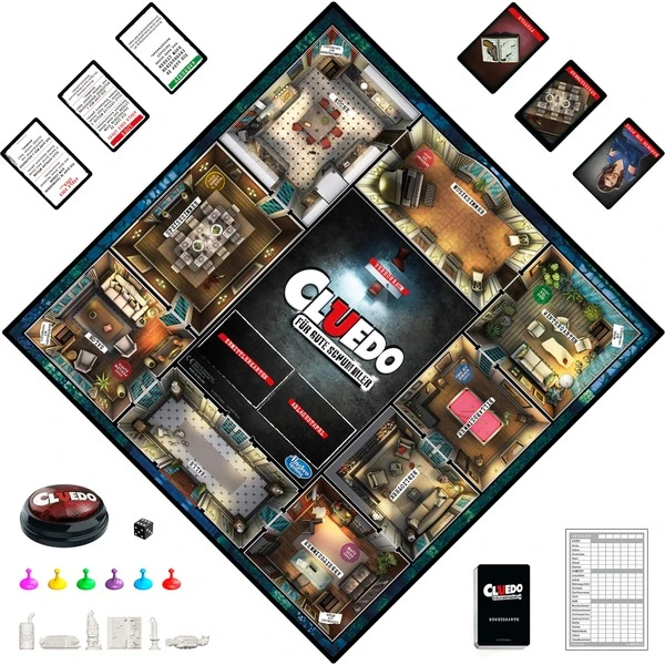 Bei Cluedo Mogeln und Mauscheln müssen die Spieler gelegentlich geschickt lügen, um die Wahrheit zu enthüllen. Hier ist jeder verdächtig und man kann niemandem trauen – auch nicht seinen Mitspielern. Mit Mauschelkarten (6 Lügen- und 6 Wahrheitskarten) schlüpfen die Spieler in die Rolle von Detektiven, um herauszufinden, wer Dr. Schwarz in der Villa ermordet hat. Ziehen Sie eine Karte, lesen Sie sie laut vor, bleiben Sie cool und überzeugen Sie Ihre Mitspieler davon, dass Sie die Wahrheit sagen… Falls ein Spieler Ihnen eine Lüge unterstellt, drückt er den Mogel-Button. Hat er Sie beim Mogeln ertappt oder haben Sie doch die Wahrheit gesagt? So oder so – eine Beweiskarte wird enthüllt und die Spieler sind der Lösung des Mordfalls einen Schritt nähergekommen. Ist ein Detektiv bereit, Anklage zu erheben, schaut er heimlich in der Fallakte nach, denn hier verbirgt sich die Antwort auf die Frage wer es war, mit welcher Waffe und in welchem Raum die Tat geschah. Bei einer richtigen Anklage gewinnt er das Spiel! Art.-Nr.: 1771690