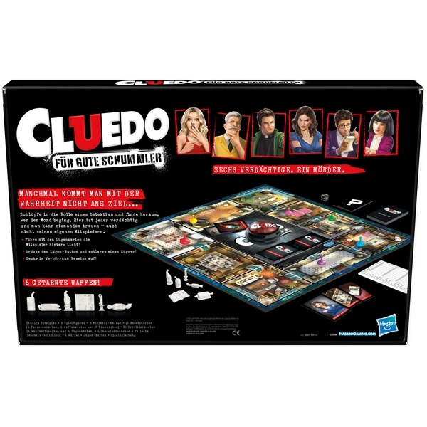 | Inhalt/Ausstattung | Spielplan, 6 Spielfiguren, 6 Miniatur-Waffen, 21 Beweiskarten (6 Personenkarten, 6 Waffenkarten, 9 Raumkarten), 12 Ermittlerkarten, (6 Wahrheitskarten und 6 Lügenkarten), 6 Übersichtskarten, Fallakte, Detektiv-Notizblock, 1 Würfel, Lügen-Button, Spielanleitung | ||