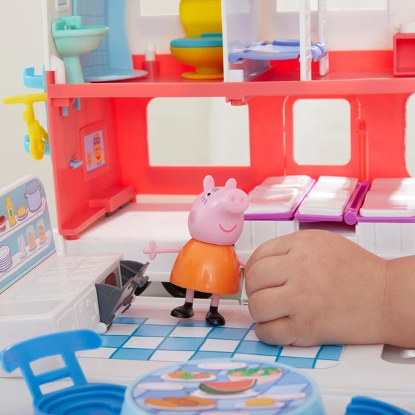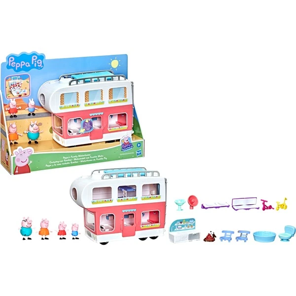 Mit dem tollen Wohnmobil von Familie Wutz können Kinder ab 3 Jahren Peppa Wutz und ihre Familie in den Urlaub fahren lassen! Das Fahrzeug kann angeschoben werden, sodass es zu allen möglichen Orten „in den Urlaub“ fahren kann. Wird das Lenkrad gedrückt, erklingt Musik aus der Serie Peppa Wutz sowie bekannte Sätze. Wenn es Zeit ist, das „Nachtlager“ aufzuschlagen, kann das Fahrzeug zu einem mehr-etagigen Wohnmobil umgebaut werden. Nun können die Figuren sich in der beweglichen Küche etwas zum Essen kochen, um das Lagerfeuer herum sitzen und ihren Campingausflug genießen. Mit der Anhängerkupplung lässt sich das Wohnmobil von Familie Wutz an Peppas rotem Familienauto befestigen. Zum Wohnmobil gehören außerdem 2 Stühle, 2 Fahrräder und sogar eine Toilette! Die 4 enthaltenen, 7,5 cm großen Figuren der Familie Wutz können im Wohnmobil Platz nehmen. Zur einfachen Aufbewahrung lassen sich alle Teile im Fahrzeug aufbewahren. Art.-Nr.: 1771801
