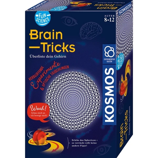 Eine Achterbahnfahrt für das Gehirn! Mit den Brain Tricks erleben Kinder verblüffende Illusionen und Effekte mit eigenen Augen. Von doppeldeutigen Figuren über selbst entworfene 3D-Bilder zum faszinierenden Sphericon – jedes Experiment ist gleichzeitig ein kleines Rätsel. Die aufregende Tour quer durch die Welt der optischen Täuschungen zeigt, wie unser Gehirn arbeitet. Dabei erklärt die Anleitung, was man seinen Augen eigentlich gar nicht glauben will! Am besten die Multi-Funktions-Brille direkt aufsetzen und durch verschiedene Experimente die verblüffende 3D-, Scharf- und Spektral-Sicht testen. Dieser KOSMOS Experimentierkasten ist wie Jogging fürs Gehirn für Kinder zwischen 8 und 12 Jahren, und fasziniert immer wieder aufs Neue!