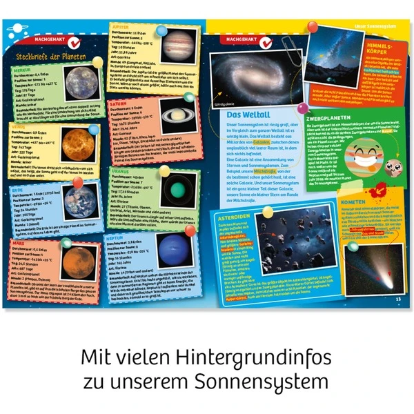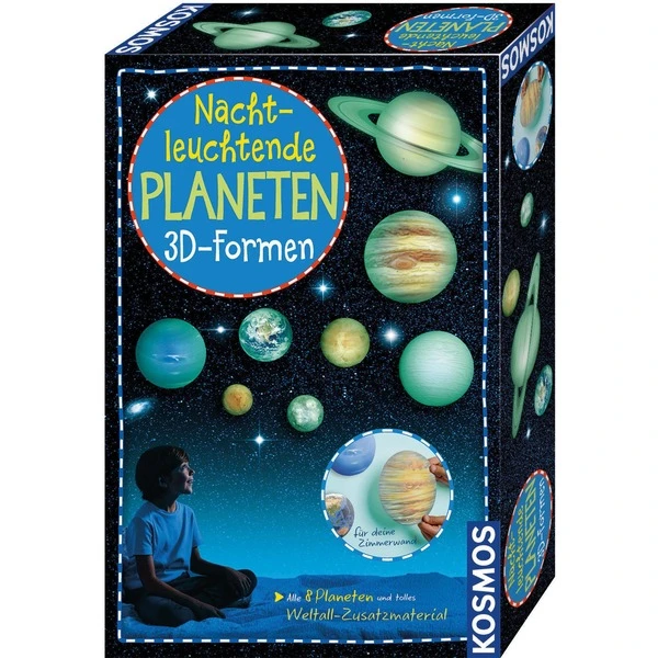 | Inhalt/Ausstattung | Planeten-Set mit 8 gewölbten Planeten für die Zimmerwand samt Aufhängung, Zusatzmaterial: Stickerbogen mit Weltraum-Motiven, Anleitung | ||