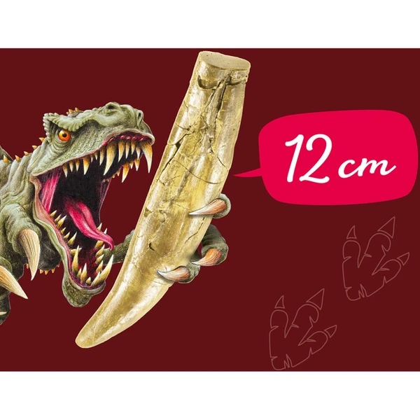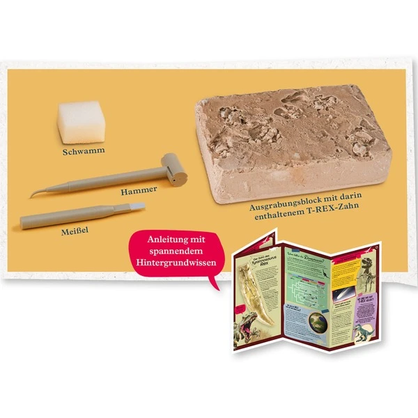 | Inhalt/Ausstattung | T-rex-Zahn in Originalgröße im Gipsblock, Hammer, Meißel, Schwamm | ||