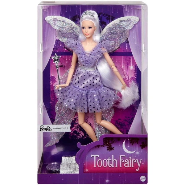 Diese Barbie-Sammlerpuppe ist ein magischer Meilenstein. Die Zahnfee überzeugt mit fantastischen Look und Zubehör: Sie trägt ein hübsches, Kleid in blau und lila, mit fließenden Rüschen, funkelnden Tupfen und perlenbesetztem Gürtel. Ihr Look wird von schimmernden Feenflügeln, einem silbrigen Zauberstab und einem mit Edelsteinen versehenen Diadem vervollständigt. Mit einem schimmernden Beutel voll silbriger Münzen und einer Verpackung mit Platz für eine persönliche Nachricht ist diese Puppe ein tolles Geschenk.Art.-Nr.: 100011062