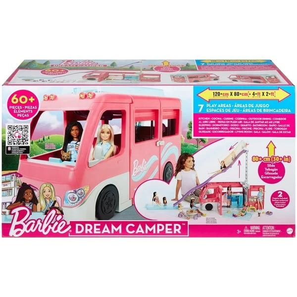 Mit dem Barbie Super Abenteuer-Camper können Kinder einen tollen Camping-Ausflug erleben. Die sieben Spielbereiche, eine tolle Rutsche und die zahlreichen Zubehörteile des Barbie-Campers inspirieren zu endlosen Abenteuern im Freien. Kinder können den Camper mit den rollenden Rädern und Platz für Fahrer und Beifahrer immer wieder neu packen und ihre Traumziele erkunden. Ist der Camper an Ort und Stelle angekommen, kommen eine Küche, ein Essbereich, ein Schlafbereich, ein Bad, ein Pool mit Rutsche und eine gemütliche Ecke mit Fernseher zum Vorschein. Jetzt können Barbie und ihre Freunde die Leiter hochklettern und mit einem Platscher in den Pool rutschen! Barbies Fahrzeug kann mit verschiedenen Aufklebern individuell angepasst werden. Über 60 Zubehörteile – darunter zwei Hündchen – erhöhen den Spielspaß. Wenn es dann Zeit zum Aufbruch wird, lässt sich alles ganz einfach im Camper verstauen.Art.-Nr.: 1846665