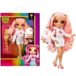 Die Fashionpuppen der Serie Rainbow High Junior High sind die jüngeren, und damit etwas kleineren Versionen der bekannten Puppen von der Rainbow High. Aber sie sind genauso schön und stilvoll gekleidet! Kia Hart ist etwa 23 Zentimeter groß und kommt mit einem mehrteiligen Outfit in rosa und weißen Tönen, einem Kamm für ihr langes Haar und einem weichen Rucksack. Art.-Nr.: 100005358
