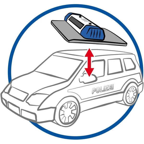 Polizei-Einsatzwagen mit Anhängerkupplung und abnehmbarem Dach bietet Platz für bis zu 4 Figuren. In der Mittelkonsole ist Platz für das enthaltene Funkgerät. Über den Umschalter an der Unterseite des Soundmoduls kann zwischen zwei verschiedenen Sirenensounds gewechselt werden. Das Licht- und Soundmodul (1,5-V-Micro-Batterie nicht enthalten) ist mit Auto-Power-Off-Technologie ausgestattet. Nach Umklappen der Rückbank findet die Hundetransportbox aus Art. 6878 Platz im Kofferraum des Fahrzeugs.