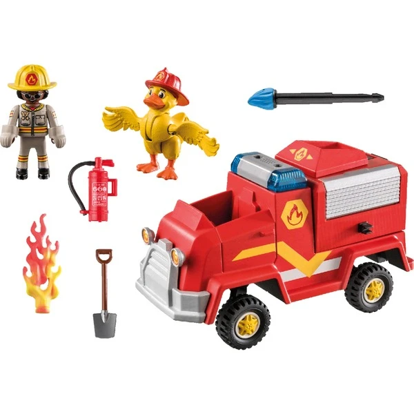 | Inhalt/Ausstattung | 1 Ducklas, 1 Freddy Fire, 1 Feuerwehr-Auto mit Kipplenkung und Licht- und Soundmodul sowie dreh- und höhenverstellbarem Container inklusive Löschkanone und 2 Klappen, 1 Flamme, 2 Wasserpfeile, 1 Leiter, 1 Feuerlöscher, 1 Spaten | ||