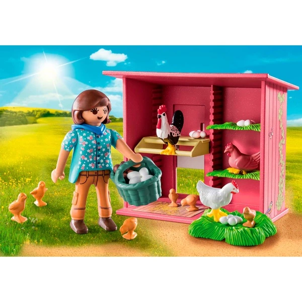 | Inhalt/Ausstattung | Figur: 1 Frau. Tiere: 6 Küken, 1 Hahn, 2 Hennen. Zubehör: 2x braune Eier, 4x weiße Eier, 3x Grasboden, 1 Hühnerhaus mit Einsatz und hochschiebbarer Tür, 1 Korb | ||