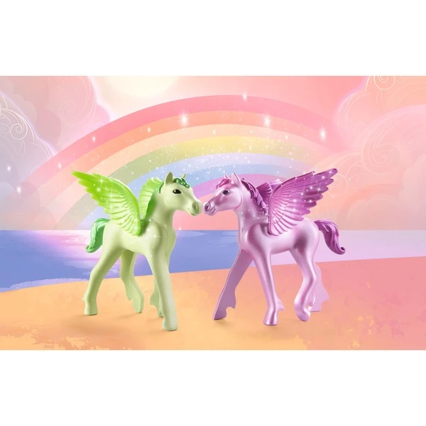 | Inhalt/Ausstattung | Figuren: 1 Regenbogenprinzessin. Tiere: 2 Pegasusfohlen. Zubehör: 1 Wolkenflieger mit Regenbogenbändern und Blütensteckern, 1 Flughelm, 1 Unterrock. | ||