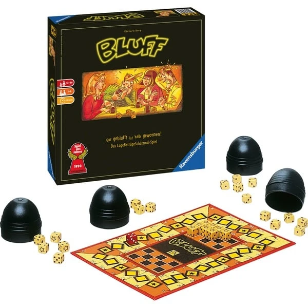 Gut geblufft ist halb gewonnen! Bluff, das LügeBetrügeSchätzmal-Spiel. Würfel und ein Becher für jeden. Shake it! Ein abschätzender Blick, eine schnelle Hochrechnung – wie viel Fünfer sind wohl im Spiel!? Die Wetten steigen … Wer legt hier wen rein!? Wer verliert als Erster die Nerven und fordert: Hoch die Becher? Jetzt sehen’s alle: Einer hat sich verzockt – und verliert so manchen Würfel. So bleiben nach und nach immer mehr Würfel – und Spieler – auf der Strecke. Nur der coolste Bluffer hält durch.Art.-Nr.: 1187110