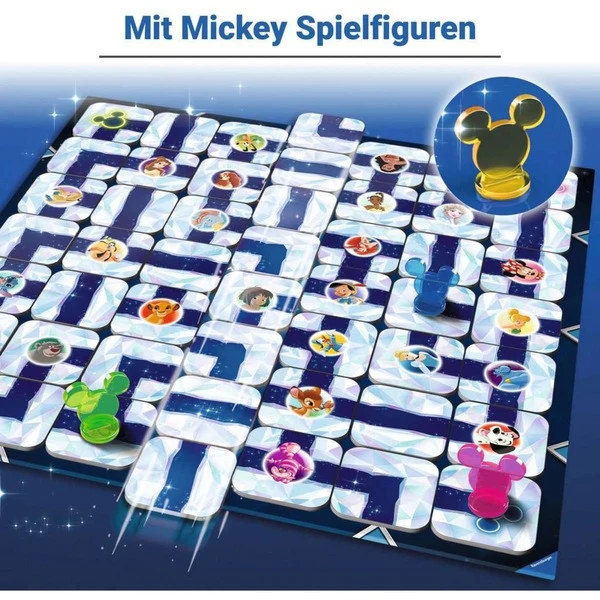 Disney 100 Labyrinth ist die Disney-Version eines beliebten Klassikers. Die Labyrinth-Karten werden beliebig auf dem Spielplan verteilt und es entsteht ein zufälliges Labyrinth. Eine Karte bleibt übrig, damit wird das Labyrinth verschoben. Wer an der Reihe ist, verschiebt zuerst das Labyrinth und zieht anschließend mit seiner Micky-Spielfigur auf den neu entstandenen Wegen voran, um den gesuchten Lieblingscharakter zu erreichen.