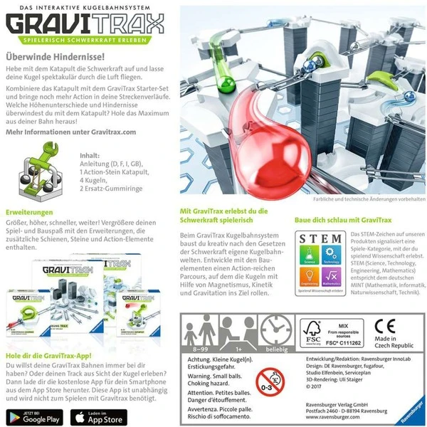 GraviTrax – das innovative Baukastensystem für anspruchsvolle Kugelbahnen. Aus einer Vielzahl an verschiedenen Bausteinen und Schienen lassen sich bei geschickter Nutzung der physikalischen Gesetze aktionsreiche Streckenverläufe planen, ausprobieren und realisieren. Mit den zahlreichen Erweiterungs-Sets wird das freie Bauen und Konstruieren des innovativen Bausystems GraviTrax jedes Mal aufs Neue noch interessanter und spannender! Mehr Möglichkeiten – mehr Spaß! Diese Erweiterung zu einem bereits bestehenden Starter-Set enthält ein Katapult, mit dem Kugeln in eine bestimmte Richtung geschleudert werden können.Art.-Nr.: 1349082