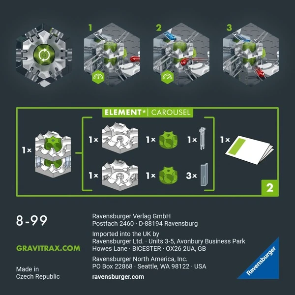 GraviTrax – das innovative Baukastensystem für anspruchsvolle Kugelbahnen. Aus einer Vielzahl an verschiedenen Bausteinen und Schienen lassen sich bei geschickter Nutzung der physikalischen Gesetze aktionsreiche Streckenverläufe planen, ausprobieren und realisieren. Mit den zahlreichen Erweiterungs-Sets wird das freie Bauen und Konstruieren des innovativen Bausystems GraviTrax jedes Mal aufs Neue noch interessanter und spannender! Mehr Möglichkeiten – mehr Spaß! Durch das Element Carousel aus der PRO-Serie werden zwei Ebenen über mehrere Ein- und Ausgänge miteinander verbunden: Der Stein kann während eines Durchlaufs mehrfach genutzt werden. Hineinrollende Kugeln können entweder im Carousel verbleiben oder dieses starten lassen, wodurch die geparkten Kugeln auf die Bahn geschickt werden. Dieses Element bringt, wenn es mit einem Starter-Set kombiniert oder in eine bereits aufgebaute GraviTrax-Welt integriert wird, ganz neuen Schwung und viele neue Möglichkeiten. Art.-Nr.: 1913168