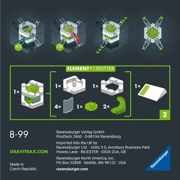 GraviTrax – das innovative Baukastensystem für anspruchsvolle Kugelbahnen. Aus einer Vielzahl an verschiedenen Bausteinen und Schienen lassen sich bei geschickter Nutzung der physikalischen Gesetze aktionsreiche Streckenverläufe planen, ausprobieren und realisieren. Mit den zahlreichen Erweiterungs-Sets wird das freie Bauen und Konstruieren des innovativen Bausystems GraviTrax jedes Mal aufs Neue noch interessanter und spannender! Mehr Möglichkeiten – mehr Spaß! Das Element Splitter aus der PRO-Serie teilt den Weg der Kugeln auf und verbindet so zwei Ebenen miteinander. Von bis zu vier Seiten können die Kugeln auf den Splitter zufahren. Je nach Geschwindigkeit und Klappenstellung rollt die Kugel entweder über das Element oder fällt durch die Klappe eine Ebene nach unten. Dieses Element bringt, wenn es mit einem Starter-Set kombiniert oder in eine bereits aufgebaute GraviTrax-Welt integriert wird, ganz neuen Schwung und viele neue Möglichkeiten. Art.-Nr.: 1913120