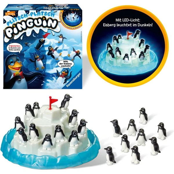 Erlebe jetzt noch mehr Spaß und Spannung, indem du deine Pinguine auch im Dunklen geschickt auf dem hell leuchtenden Eisberg platzierst. Wer als Erster alle seine Pinguine auf dem wackligen Eisberg unterbringt, gewinnt. Plitsch-Platsch Pinguni besitzt auch eine einfache Spielvariante für Kinder ab 4 Jahren.Art.-Nr.: 1345739