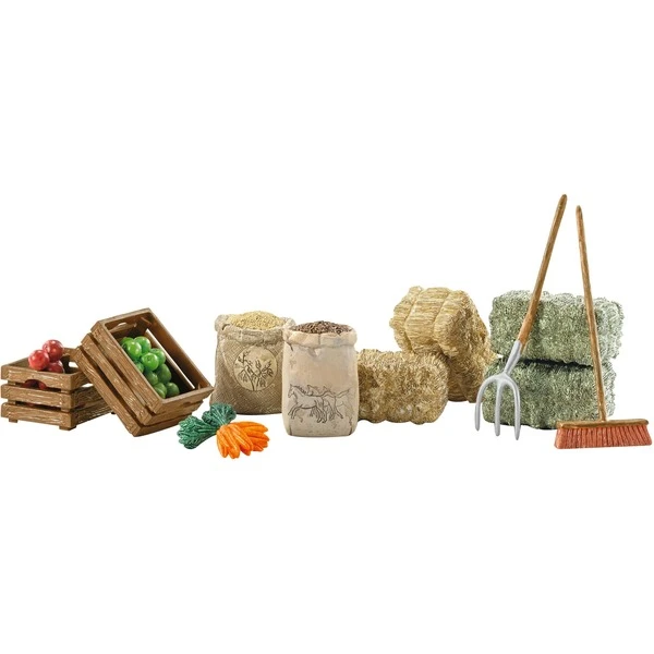 | Inhalt/Ausstattung | 1x Heuballen, 1x Strohballen, 1x Heugabel, 1 x Besen, 2 x Karotten, Hafersack, Pelletsack, 2 x Futterkisten, 2 x Äpfel rot, 2 x Äpfel grün | ||