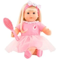 Diese etwa 36 Zentimeter große Weichkörperpuppe kann sitzen und ihren Daumen im Mund behalten. Sie kommt in einem süßen Outfit: Ein pinkes Kleid mit Schwanen-Print, eine bunte Schleife und bunter Kragen. Mit dabei hat sie eine Bürste für ihr langes, blondes Haar. Die Schlafaugen lassen die Puppe friedlich ihre Augen schließen, wenn sie hingelegt wird. Mit ihrem geringen Gewicht ist sie auch für kleine Kinder leicht zu tragen und daher gut zum Kuscheln und Umarmen geeignet. Wie alle Corolle-Puppen riecht sie angenehm zart nach Vanille.Art.-Nr.: 1743194