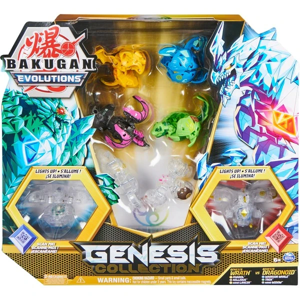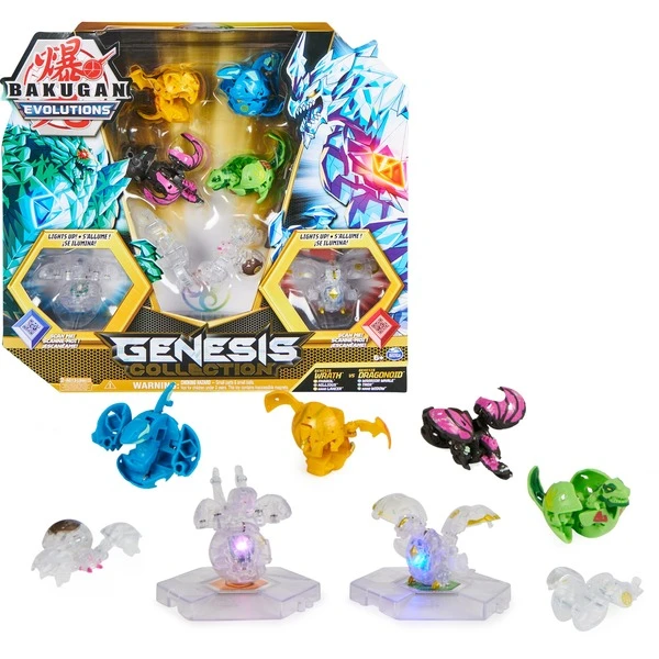 | Inhalt/Ausstattung | 2 Genesis (Leucht-) Bakugan, 4 exklusive Bakugan Balls, 2 exklusive Nanogan, 6 Charakterkarten, 2 Fähigkeitskarten, 4 BakuCores, 2 Portalkarten, 2 Genesis-Bakugan Ausstellungsplattformen, 1 Bakugan Spielanleitung, 1 Bakugan Sammelübersicht | ||