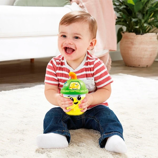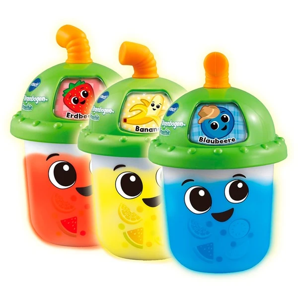 Bunter Spielspaß mit Babys Regenbogen-Smoothie! Wird der Strohhalm gedreht, leuchtet der Smoothie in der Farbe der gewählten Frucht und benennt sie. Der Smoothiebecher reagiert mit lustigen Sätzen und Musik und Rasselperlen im Inneren lösen zusätzliche Geräusche aus. Ein tolles Spielzeug für Kinder ab 6 Monaten, das ganz nebenbei die motorischen Fähigkeiten und die Hand-Auge-Koordination fördert.Art.-Nr.: 1895991