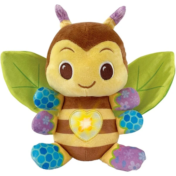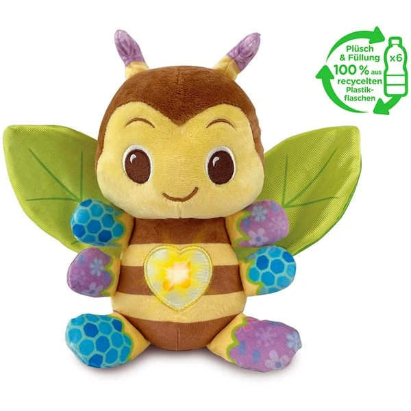 Die VTech Musik-Kuschelbiene flattert mit ihren weichen Flügeln direkt ins Herz! Die leuchtende Herztaste löst beruhigende Musik, liebevolle Sätze und lustige Geräusche aus. Die Flügel aus Knistermaterial fördern die sensorische Wahrnehmung und de verschiedenen Stoffarten (Velour, Jersey, Satin) regen den Tastsinn an. Die Biene kann als Handpuppe verwendet werden: Die Hände können von hinten in die Flügel gesteckt werden, sodass die Biene mit den Flügeln schlägt. Die Musik-Kuschelbiene besteht aus weichem, nachhaltigem Material, das auf Basis von sechs recycelten Plastikflaschen hergestellt wurde. Nach Entnahme des elektronischen Moduls kann die flauschige Begleiterin in der Waschmaschine gewaschen werden.Art.-Nr.: 100004628