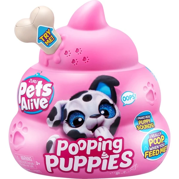 Diese bezaubernden Welpen kuscheln, bellen und fressen sogar wie echte Welpen. Wenn die Bäuchlein der Popping Puppies voll sind, muss der Inhalt raus und dabei gibt es eine Farbwechsel-Überraschung. Die Pets Alive Pooping Puppy Welpen werden schnell zum pelzigen besten Freund. Es gibt insgesamt 3 Welpen zum Sammeln.